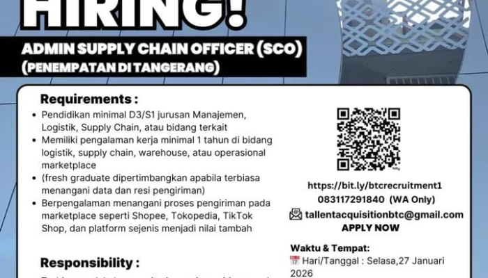 | Admin SCO | D3/S1 (Manajemen/Logistik/Supply Chain) | Min. 1 tahun pengalaman di logistik/marketplace. Fresh graduate yang terbiasa menangani data dipersilakan. |