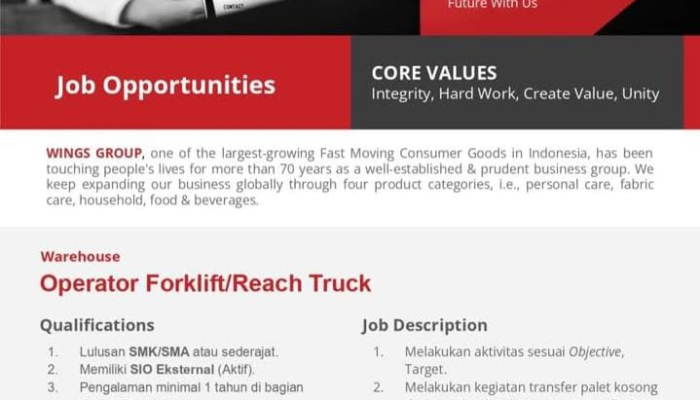 Sebagai grup bisnis yang telah berpengalaman lebih dari 70 tahun, Wings Group terus berekspansi secara global melalui produk-produk unggulan di kategori personal care, fabric care, household, hingga food & beverages. Kami mengundang talenta berbakat untuk bergabung dalam tim profesional kami dengan menjunjung tinggi nilai inti: Integrity, Hard Work, Create Value, dan Unity.
