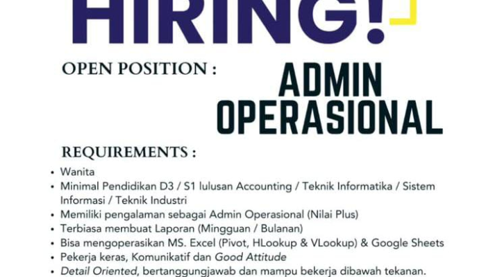 - Memiliki pengalaman sebagai Admin Operasional (menjadi nilai tambah).