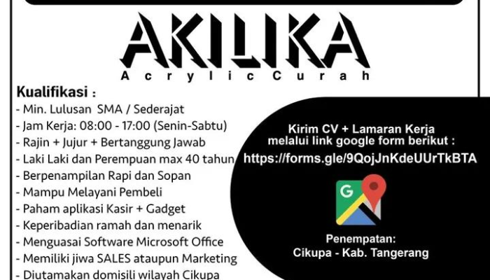 Apakah Anda seorang pribadi yang jujur, rajin, dan memiliki jiwa pelayanan yang tinggi? Akilika Acrylic Curah saat ini sedang membuka kesempatan karir bagi Anda untuk bergabung sebagai Admin Penjaga Toko. Kami mencari individu yang kompeten untuk memberikan pelayanan terbaik bagi pelanggan kami di wilayah Cikupa, Kabupaten Tangerang.