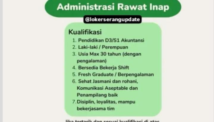 Berikut adalah kriteria yang dibutuhkan untuk mengisi posisi Administrasi Rawat Inap di RS Hermina Ciruas: