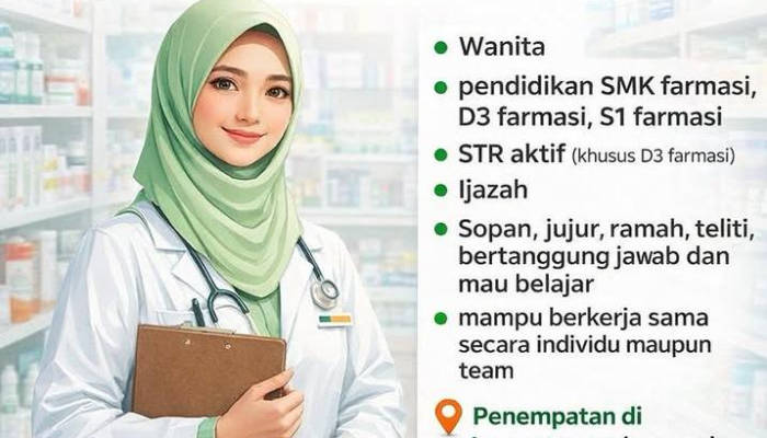 • Pendidikan: Minimal lulusan SMK Farmasi, D3 Farmasi, atau S1 Farmasi.