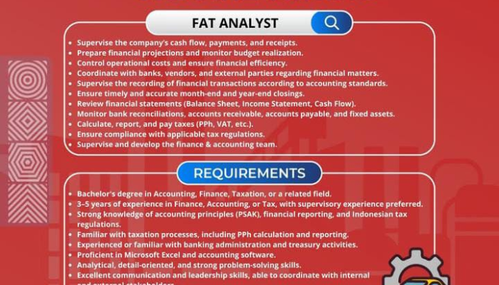 - Pendidikan minimal S1 (Bachelor’s degree) di bidang Akuntansi, Keuangan, Perpajakan, atau bidang terkait lainnya.