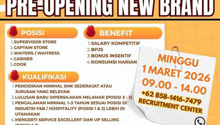 - Fresh Graduate atau lulusan baru dipersilakan melamar untuk posisi Waiters, Cashier, dan Cook.
