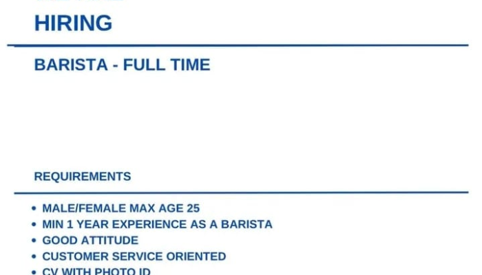 - Pengalaman: Minimal 1 tahun pengalaman kerja sebagai Barista.
