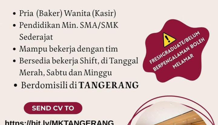 Sedang mencari peluang karir di industri bakery yang berkembang pesat? Mako Cake & Bakery kembali membuka lowongan kerja untuk posisi Crew Store (Baker & Kasir) khusus penempatan di area Tangerang. Bagi Anda yang memiliki semangat kerja tinggi, mampu bekerja dalam tim, dan siap berkarier di dunia F&B, inilah kesempatan terbaik untuk bergabung!