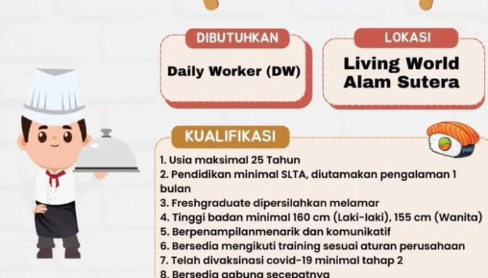 Lokasi Kerja: Living World Alam Sutera, Tangerang Selatan. Deadline: Segera kirimkan lamaran Anda karena kebutuhan bersifat mendesak.