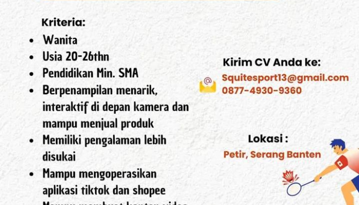 Apakah Anda seorang wanita yang percaya diri di depan kamera, komunikatif, dan mahir menggunakan platform media sosial? Peluang karir menarik kini hadir di wilayah Petir, Serang! Kami sedang mencari Host Live Streaming yang kreatif dan interaktif untuk bergabung dalam tim penjualan produk kami yang dinamis. Jika Anda menyukai tantangan dalam dunia digital marketing dan e-commerce, inilah saatnya Anda bersinar!
