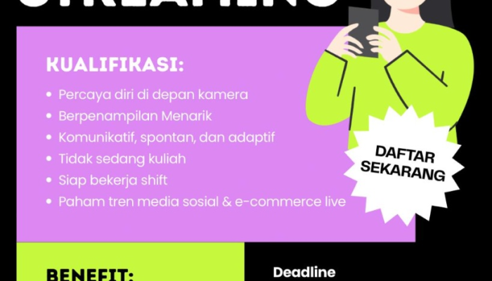 - Siap bekerja shift: Bersedia mengikuti jadwal jam kerja yang telah ditentukan, termasuk pada jam-jam produktif live streaming.