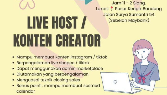 Apakah Anda seorang wanita yang bersemangat, kreatif, dan memiliki pengalaman di dunia live streaming dan pembuatan konten? Pasar Keripik Bandung sedang mengadakan Walk-in Interview untuk posisi Live Host / Konten Kreator. Ini adalah kesempatan emas bagi Anda yang ingin berkarir dan berkontribusi langsung dalam mempromosikan produk lokal di media sosial.