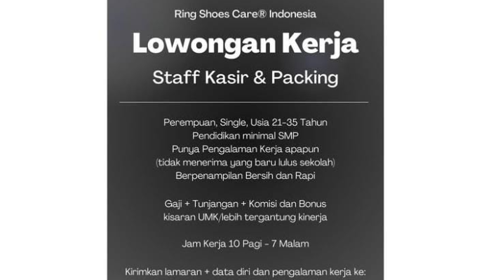 Ring Shoes Care® Indonesia adalah penyedia jasa perawatan sepatu profesional yang sedang berkembang pesat di wilayah Tangerang. Mereka mencari staf yang teliti dan berpenampilan rapi untuk mendukung operasional harian toko.