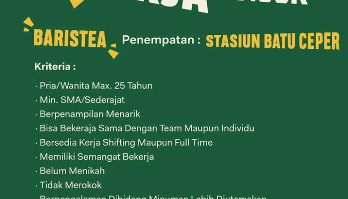 - Pengalaman: Diutamakan yang memiliki pengalaman di bidang minuman.
